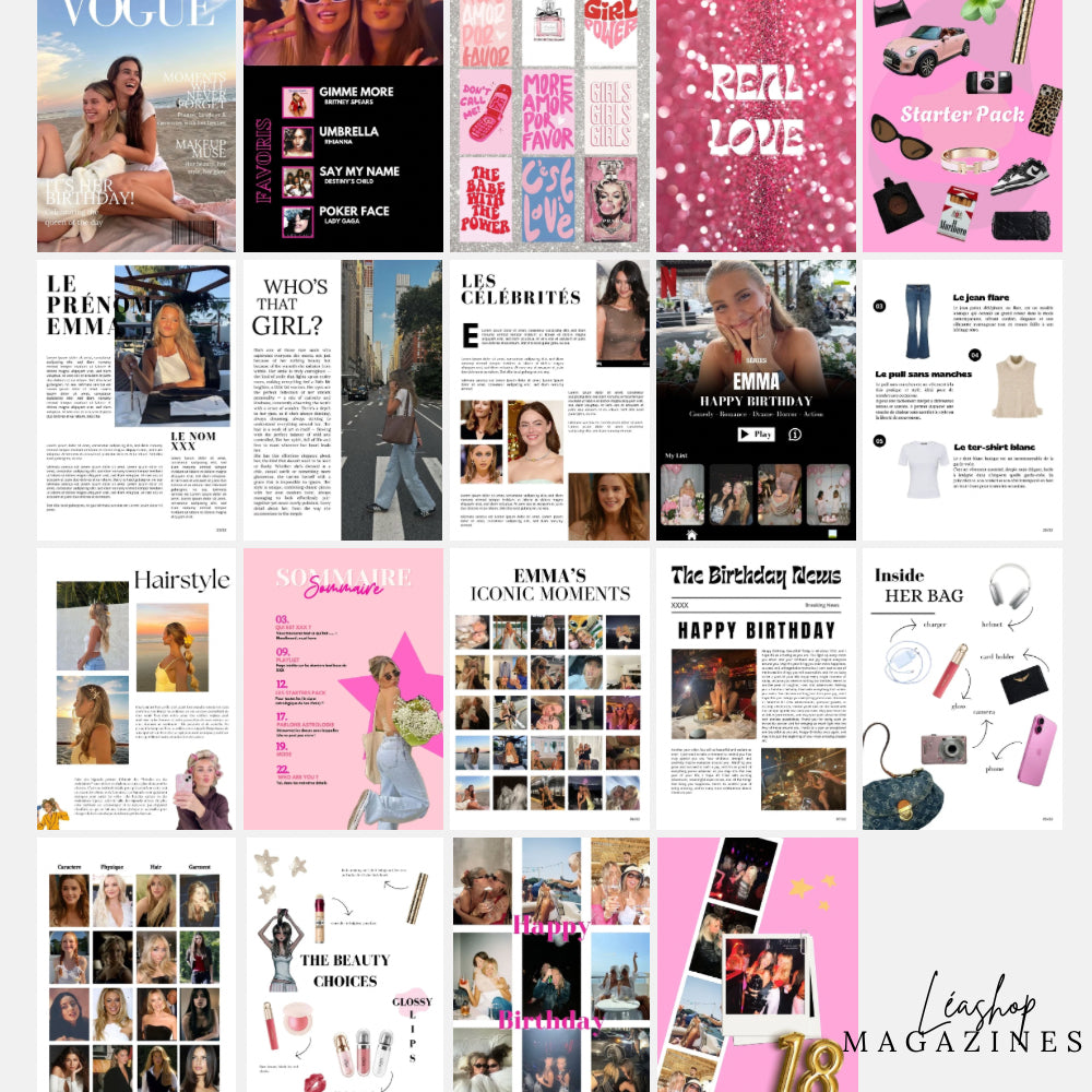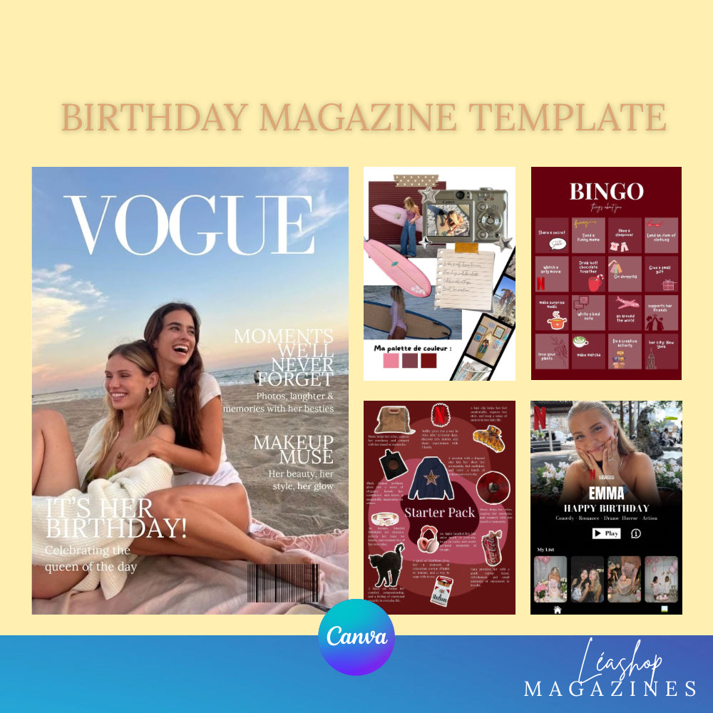 Offre à ta meilleure amie un cadeau unique et inoubliable ! Ce magazine de plus de 50 pages est conçu pour célébrer son anniversaire avec style et tendresse. Tu pourras y ajouter tes photos préférées, écrire des textes personnels et customiser chaque page selon vos souvenirs et votre complicité. Chaque détail est entièrement personnalisable sur Canva, pour un résultat 100 % à ton image. 🎀